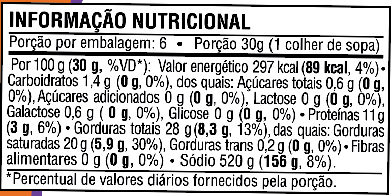| Conservação | Conservar de 1° a 10°C. Após aberto, consumir em até 5 dias. |