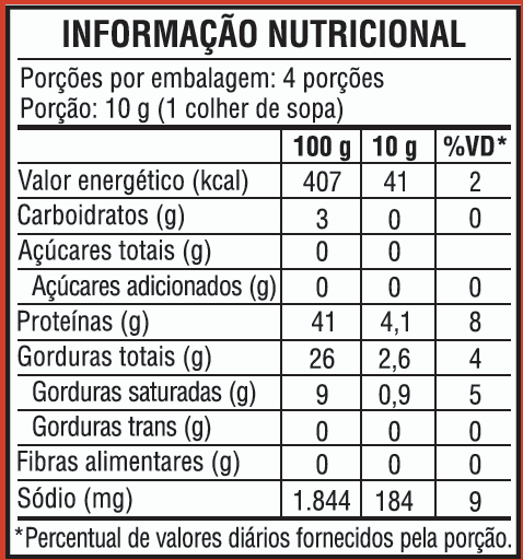 Conservação | Mantenha sob temperatura ambiente, em local seco e arejado. Após aberto, consumir em até 5 dias. |