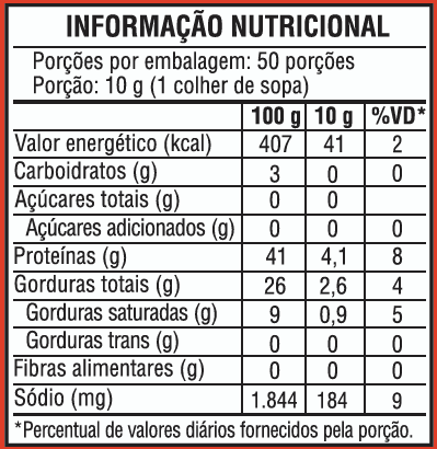| Conservação | Mantenha sob temperatura ambiente, em local seco e arejado. Após aberto, consumir em até 5 dias. |